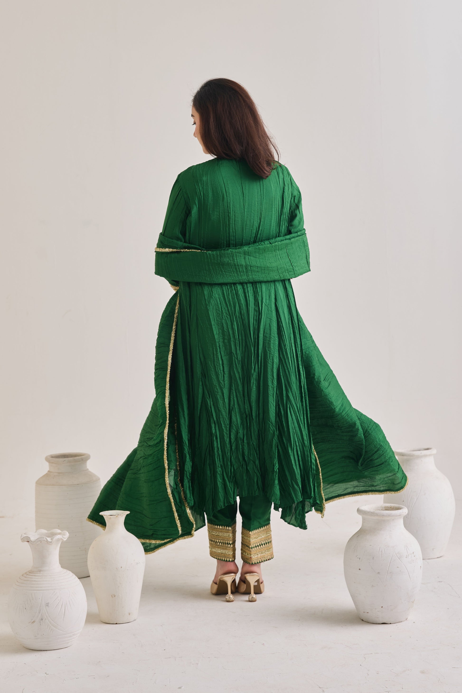 This ensemble in green crushed silk is perfect for festivities. The kurta is crafted from textured silk with a naturally crinkled finish, detailed with a front dori and handmade beaded tassels.