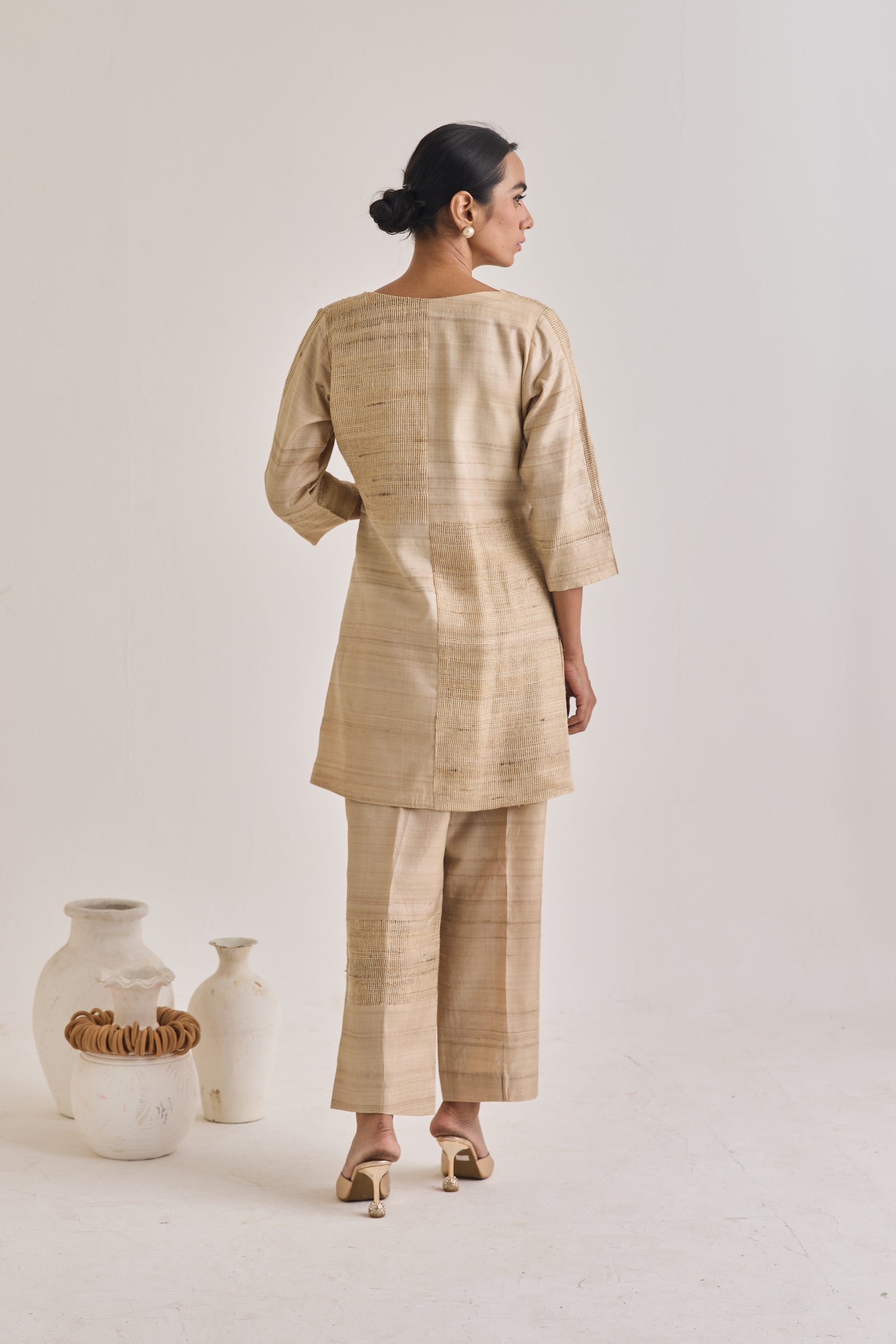 A refined take on texture and structure, this co-ord set is handcrafted in a combination of Hathkarga and Kora tussar silk.
