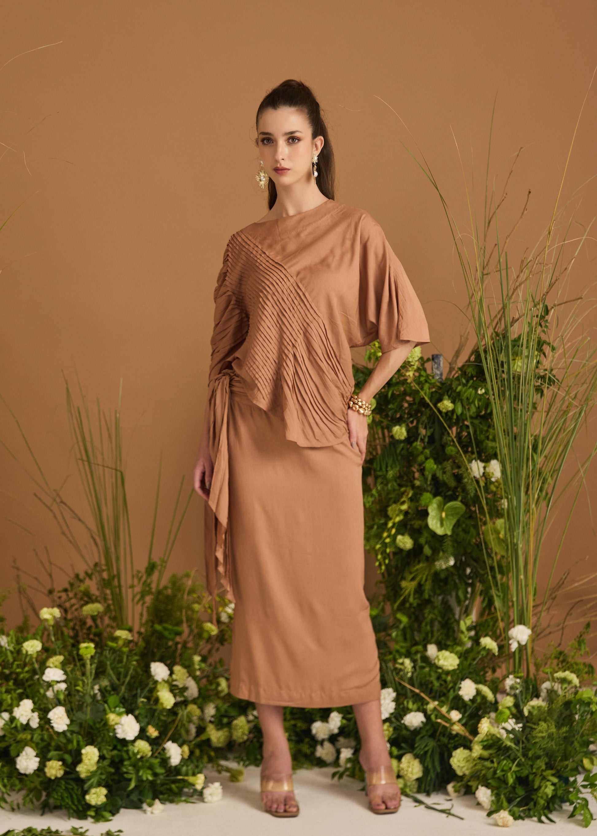 Crafted in soft modal cotton, this co-ord set pairs a clean round-neck top with sharp diagonal pleats that flow across the bodice and sleeves, ending in an asymmetric hem. The straight-cut skirt is finished with a draped pleated panel at the waist, front and back, cascading down to a side, that can be tied loosely to define the silhouette with ease and elegance.