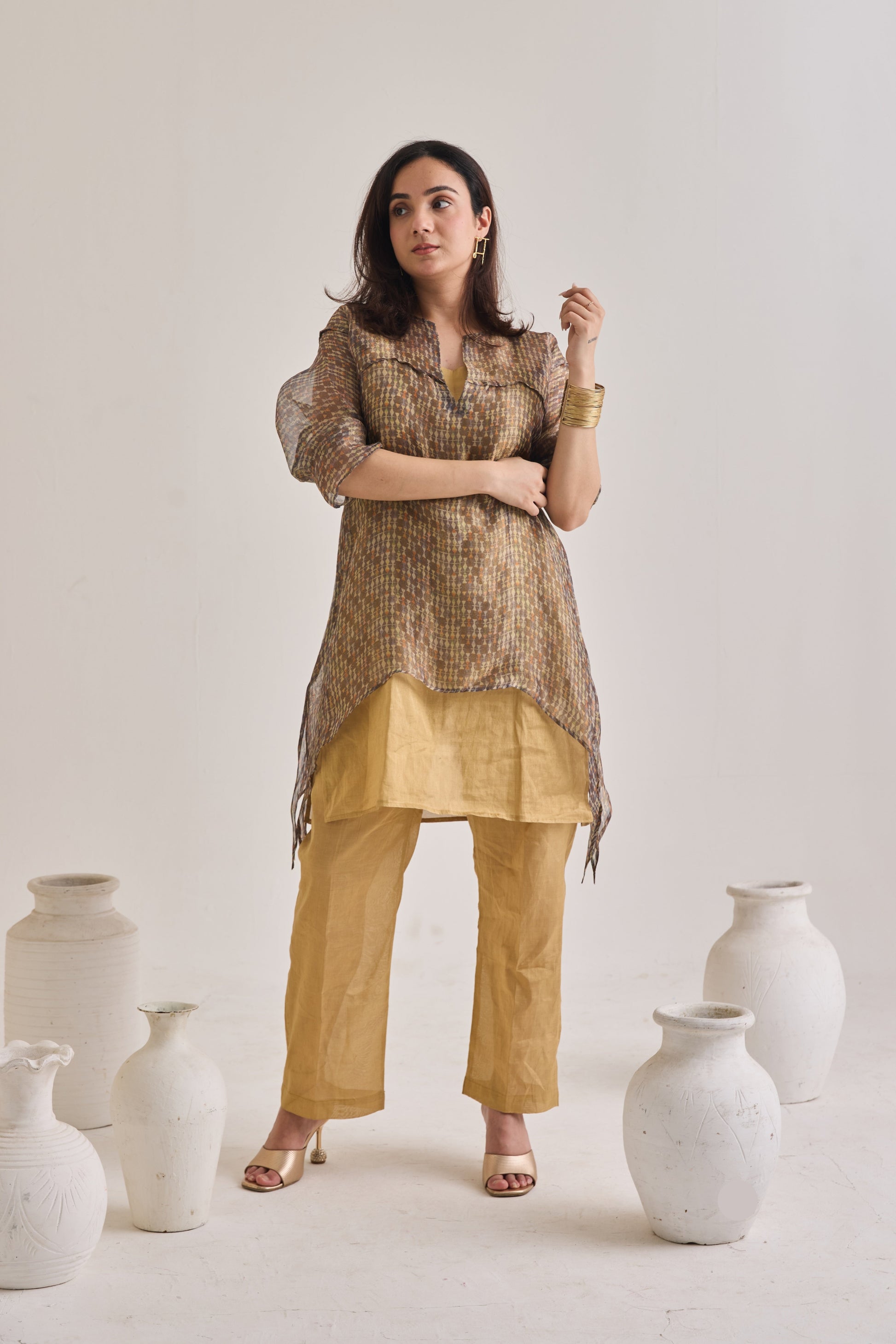 Worn beneath is a sleeveless chanderi kurta that doubles as a slip, paired with matching chanderi pants for a cohesive look.