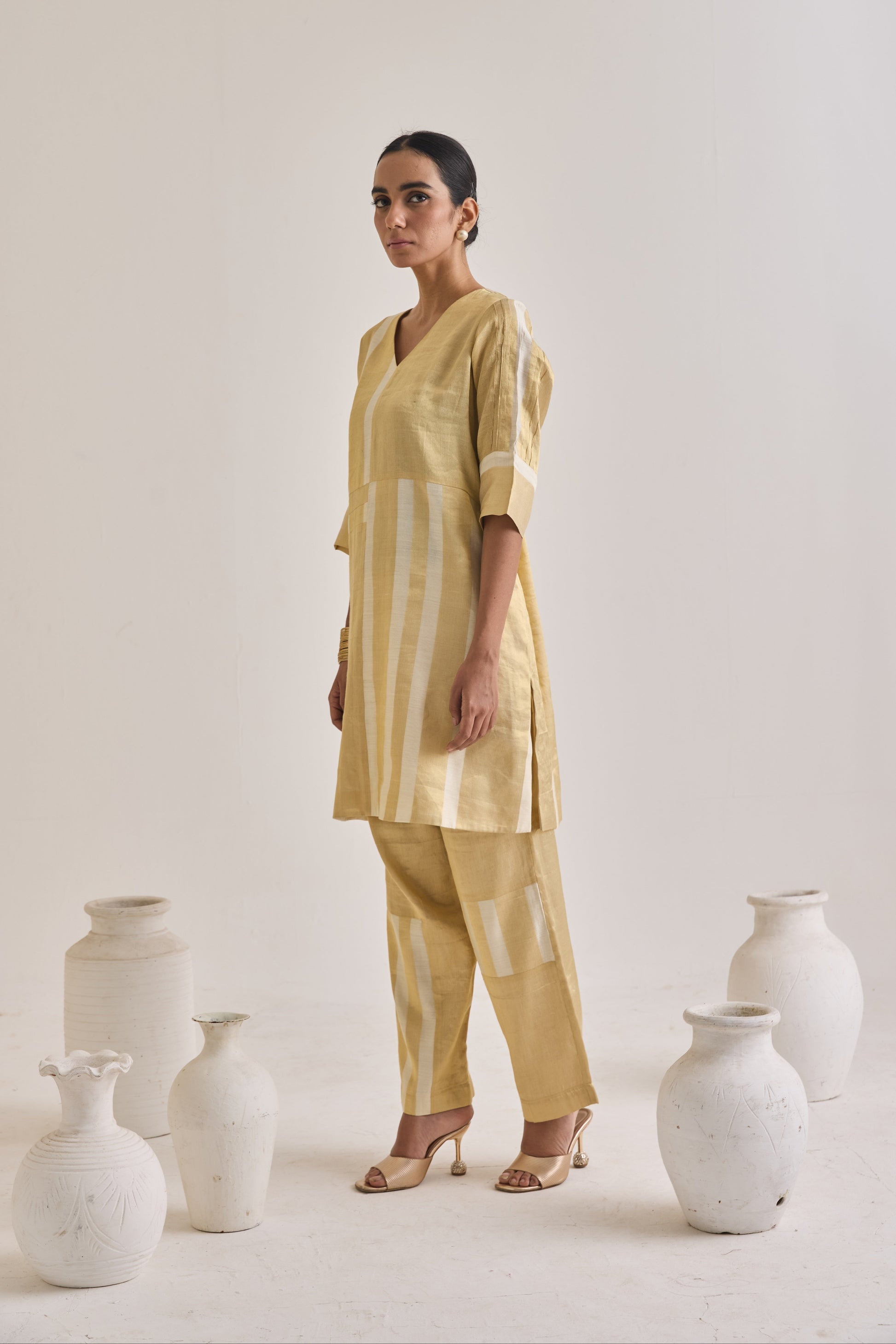 Understated yet striking, this golden kurta set features a blocked stripe design in which the distinct white and golden panels are not printed or woven but individually sewn together.