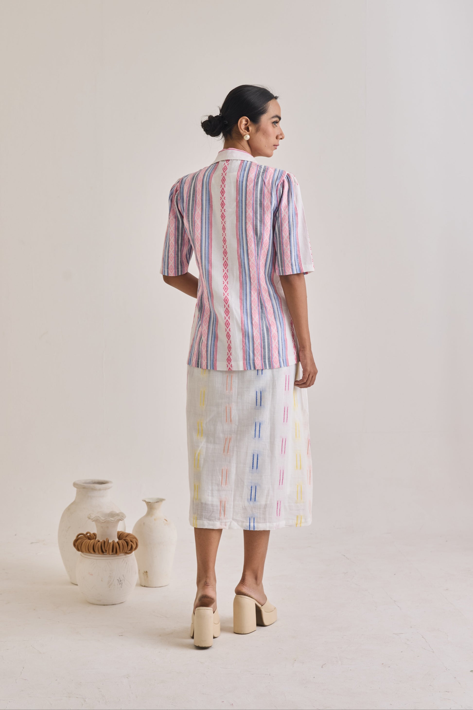 A playful yet polished pairing, this co-ord set features a sleeveless V-neck dress adorned with subtle multicolour self-weave motifs, layered with a short-sleeved striped blazer.